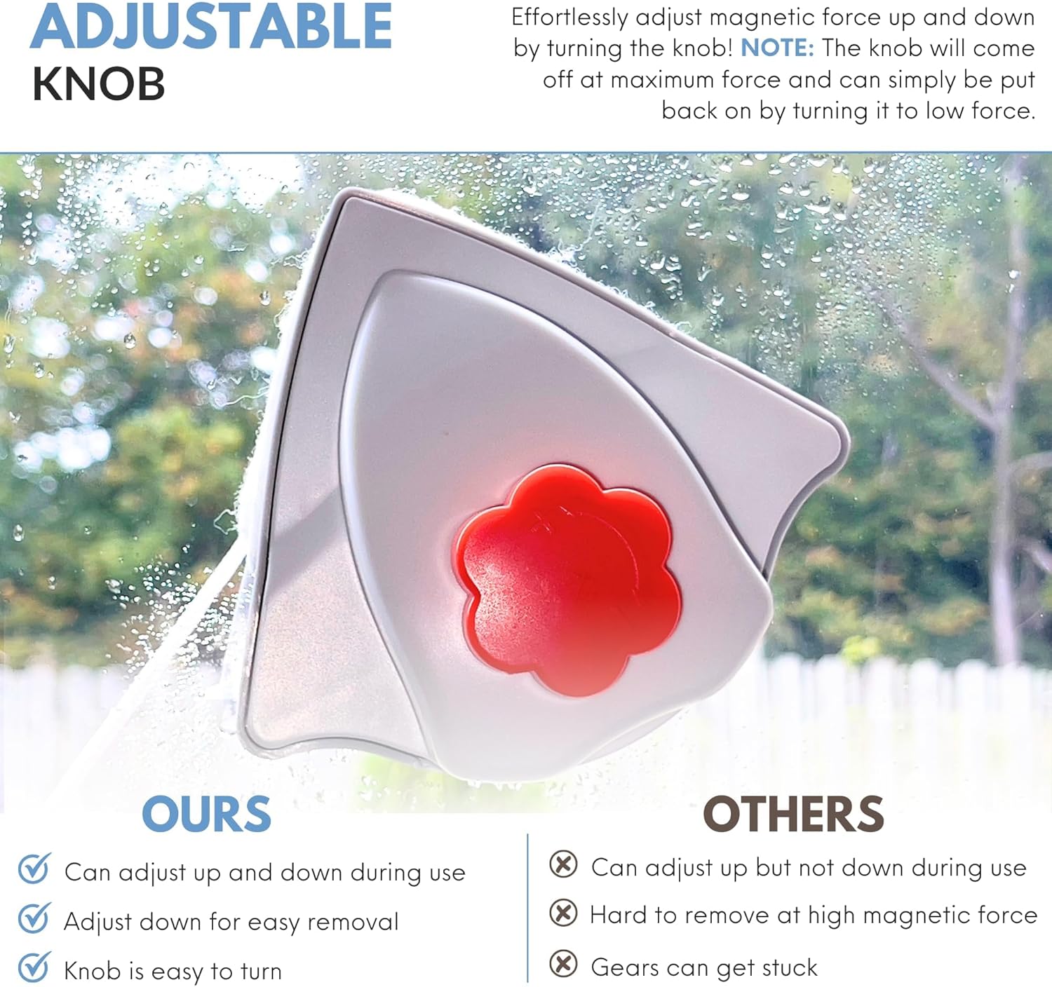 - ADJUSTABLE KNOB: Effortlessly adjust the magnetic strength up and down as desired by just turning the knob. Designed to work on single pane and double pane windows with glass thicknesses between 0.1-1 inch (3-26mm). Please note that the knob acts as a key that comes off at maximum strength, but it can simply be put back on by turning to low strength. For safety, always turn down magnetic strength and put the separator in between window cleaning magnet when not in use.