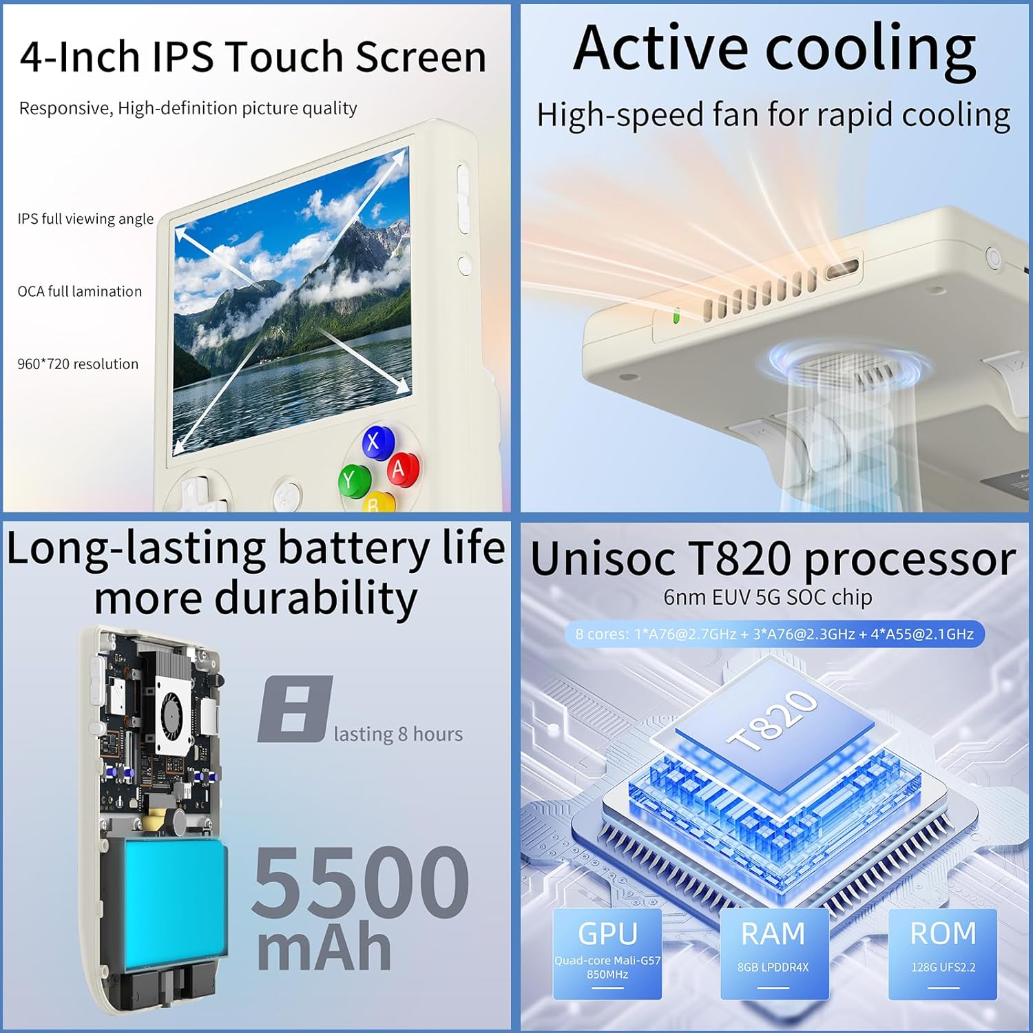 - RG406V Upgrade Technology and Performance: The Anbernik RG 406V uses an Unisoc T820 processor, an 8-core 6nm EUV 5G SOC chip, combined with a quad-core Mali-G57 operating frequency of 850Mhz to deliver high performance with lower power consumption. With 8GB of LPDDR4X RAM and 128GB of UFS2.2 storage, the rg406v offers plenty of room for your games and apps. Run on Android 13 for a smooth and up-to-date user experience.
