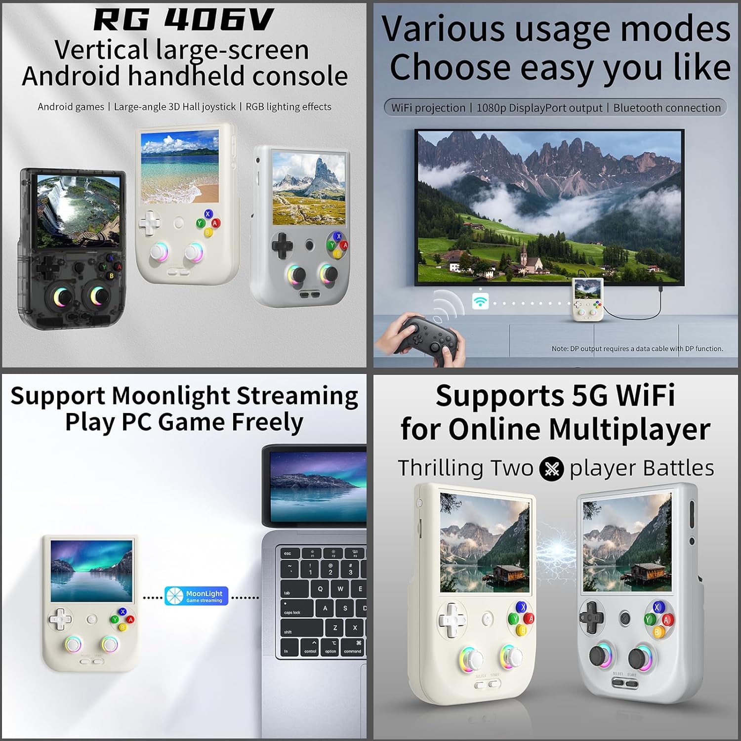 - The rg406 v supports Wireless Screen Casting-Imagine playing your favorite games on the big screen—this console has you covered with wireless screen casting! Simply sync it to your TV, grab your Bluetooth controller, and experience multiplayer action right from your couch. It is suitable for carrying aroundis a great for boyfriend, husband, brother, son, father and friends for birthday, Father's Day, Christmas, Valentines Day, Thanksgiving Day etc.