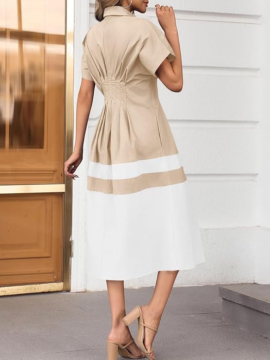 - Dress Chic Design: It features a button-down design with a collar V-neck, adding a touch of sophistication. The color block pattern enhances the visual appeal. Corset waist and pleated design accentuates the figure, while the midi length is versatile